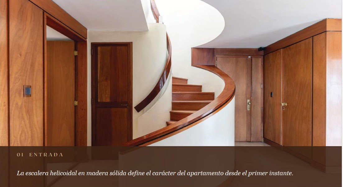 Desde el primer instante, el inmueble impacta con su escultural escalera helicoidal en madera sólida, un elemento arquitectónico distintivo que define el carácter del espacio y aporta elegancia y personalidad.