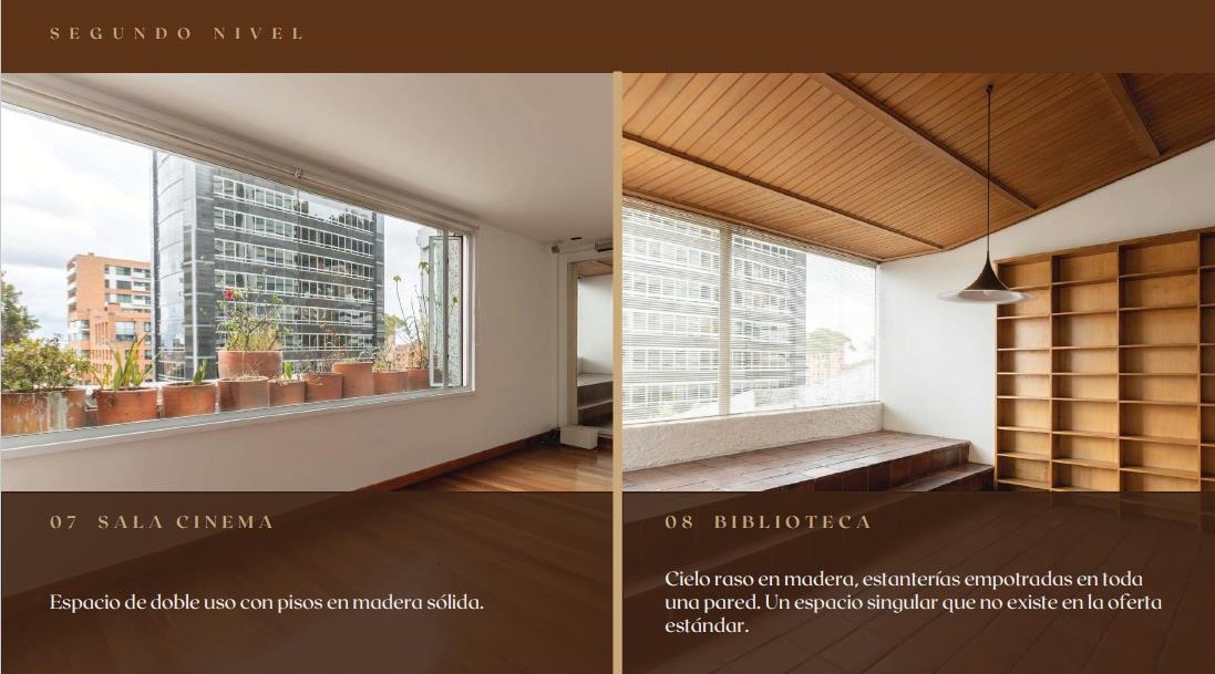 Ambiente versátil con pisos en madera sólida, ideal como sala audiovisual o espacio familiar.